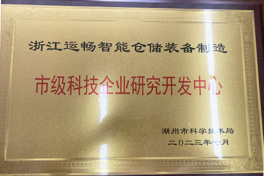 浙江運暢智能裝備股份有限公司被湖州市科技局授予湖州市科技企業(yè)研發(fā)中心